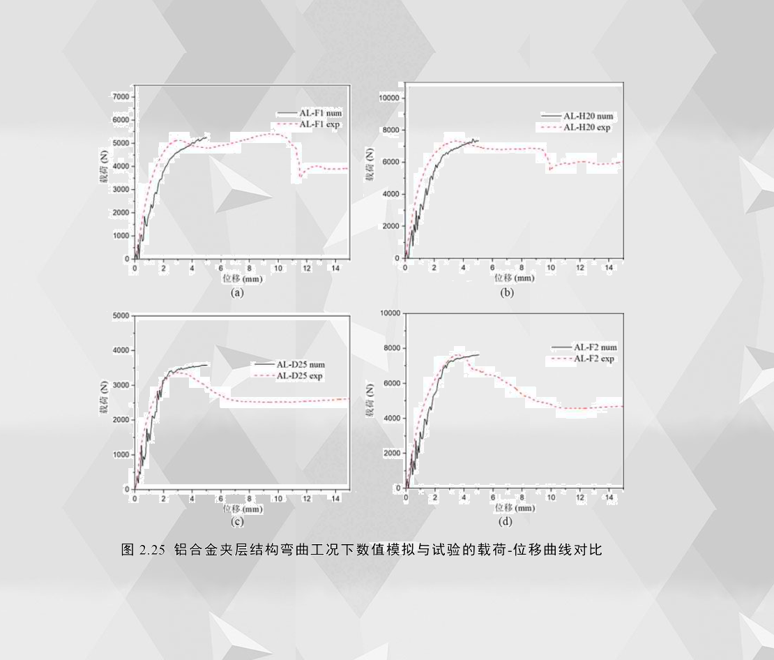 圖2.25展示了四種試件在彎曲位移0至5mm的數值模擬載荷-位移曲線及其相應的實驗曲線,其中(a)和(b)的臨界失效模式為壓痕壓入(IN),(c)和(d)為芯層剪切(CS),圖中曲線均為原始數據,未作濾波處理。