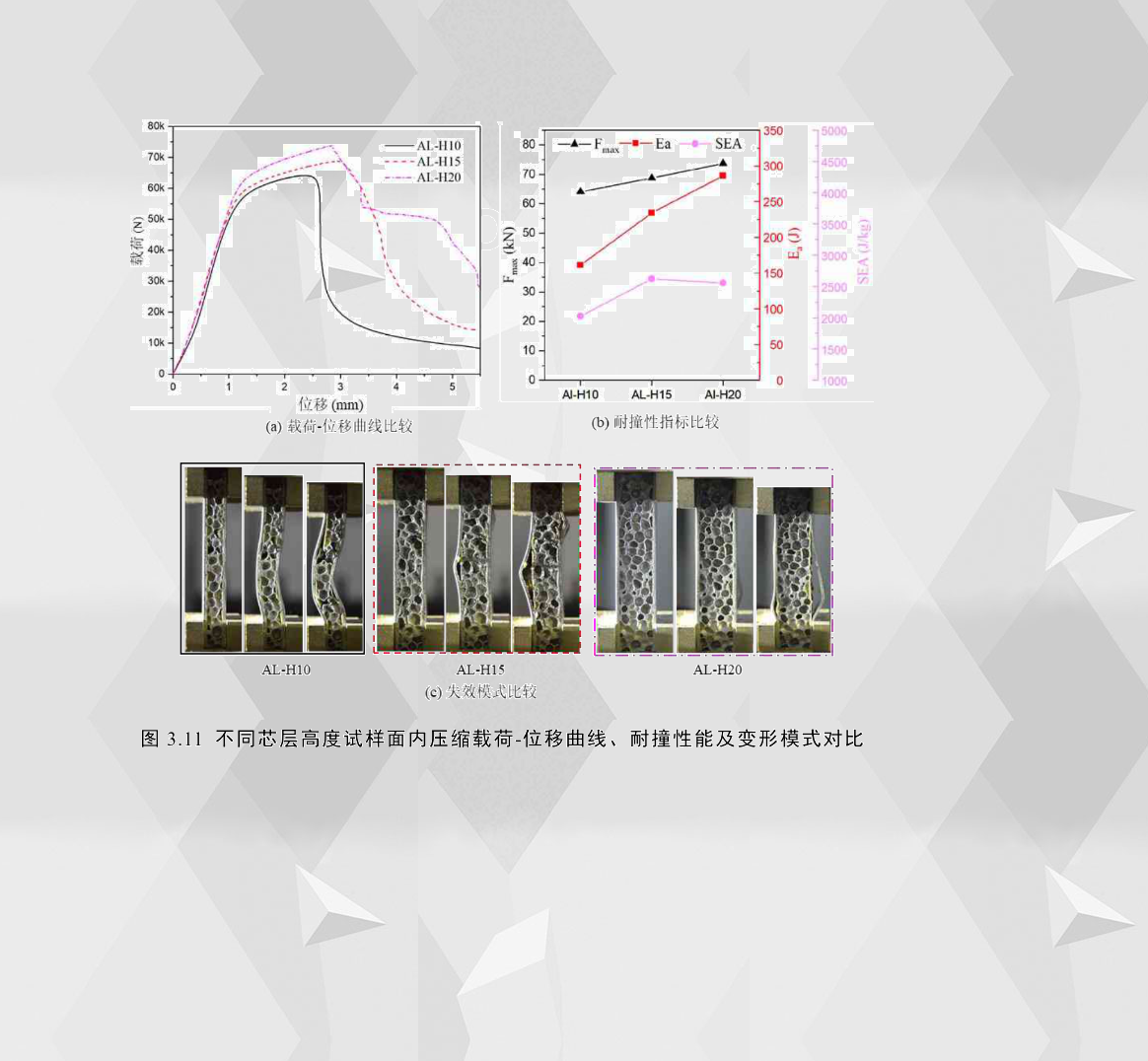 從其耐撞性指標圖3.11(b)中可以看出,鋁合金夾層結構的峰值載荷及總吸能隨芯層高度的增加而增加,而其比吸能的變化趨勢則不然。當夾層結構的芯層高度從10mm增加到15mm,試件在第三階段的主要失效模式由整體屈曲變為面板屈曲,芯層破壞方式也發生了變化,由于后者的失效模式吸收的能量比前者多很多,所以即使結構的重量有所增加,但AL-H15的比吸能(SEA)仍比AL-H10高。而當夾層結構的芯層厚度從15mm增加到20mm時,試件在第二、三階段的主要失效模式基本未發生變化,雖說后者在第三階段的吸能會更多一些,但畢竟總吸能提高的幅度有限,所以AL-H15比AL-H20的比吸能(SEA)更高。
